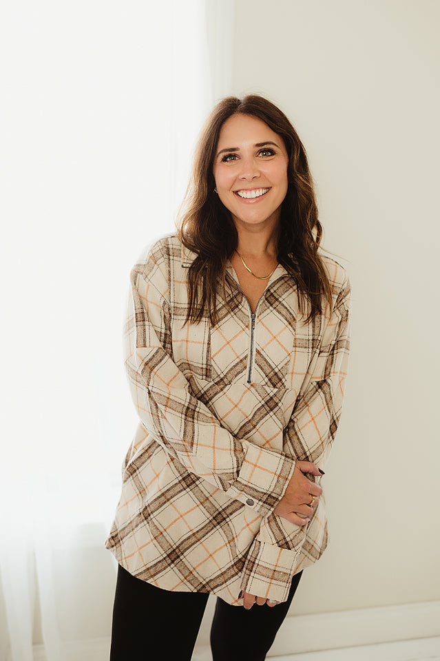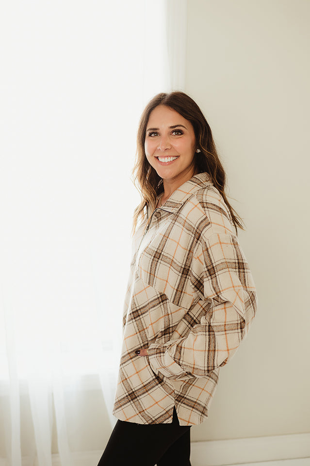 Wrap yourself in comfy charm with the oversized Mya Plaid Pullover. Its slouchy fit and easy zip neckline make layering a breeze, perfect for chilly mornings or relaxed outings. Effortlessly cozy and stylish, this pullover is ready to become your go-to for cooler days.