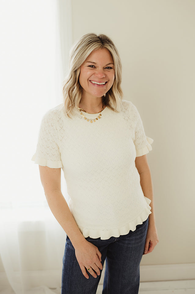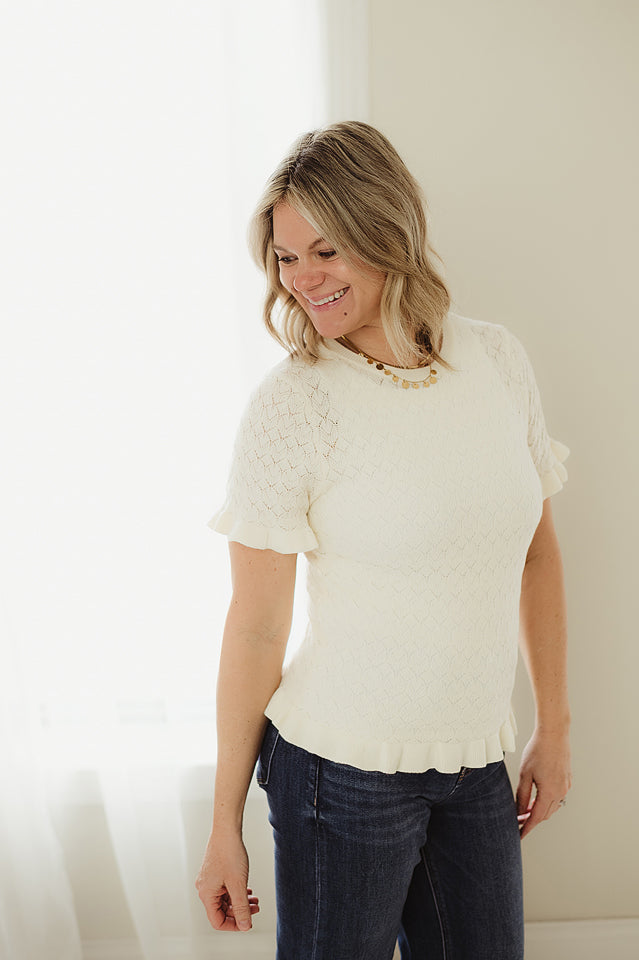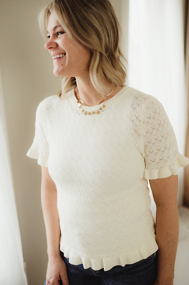 Delicate and feminine, the Whispering Ruffles Sweater adds a soft, romantic touch to your everyday wardrobe. Crafted in a lightweight pointelle knit, it features subtle openwork detailing for breathable comfort and texture. Ruffled accents lend a playful, polished finish, while the flattering silhouette makes it easy to dress up or down. Pair it with denim for a casual-chic look or style it with a skirt for an effortlessly elevated ensemble.
