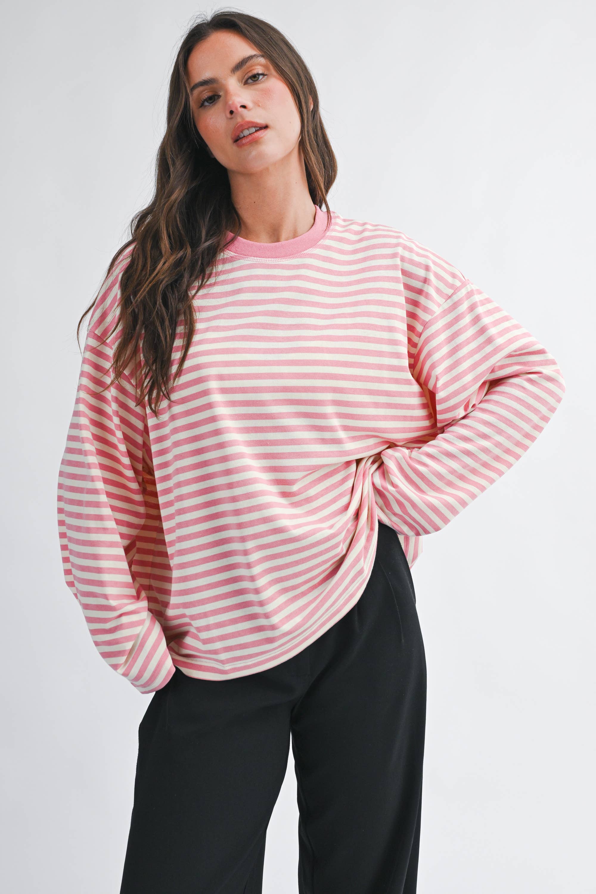Laidback Lines Pullover, an easy, throw-on stripe long sleeve with an oversized, relaxed fit and soft knit feel. Designed with dropped shoulders and a lived-in drape that pairs effortlessly with denim, cutoffs, or layered looks year-round.