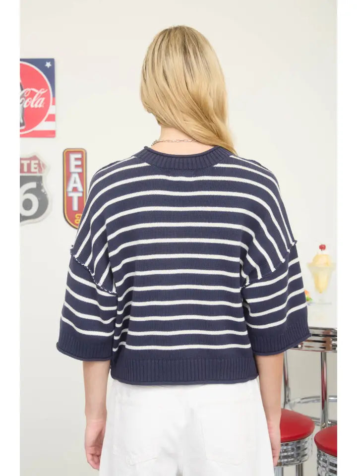 The Boardwalk Pullover striped knit top features a classic round neckline and relaxed drop shoulders for an effortlessly casual feel. Designed with a slightly loose fit, it offers comfortable, easy movement while maintaining a flattering silhouette. The rolling edge hem adds a subtle, lived-in detail that enhances its laid-back charm, making it a versatile staple perfect for everyday styling.