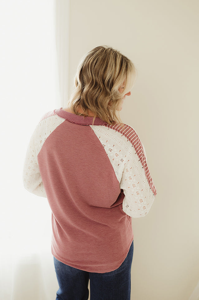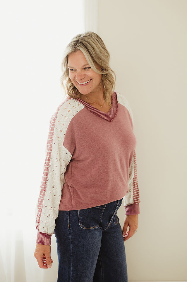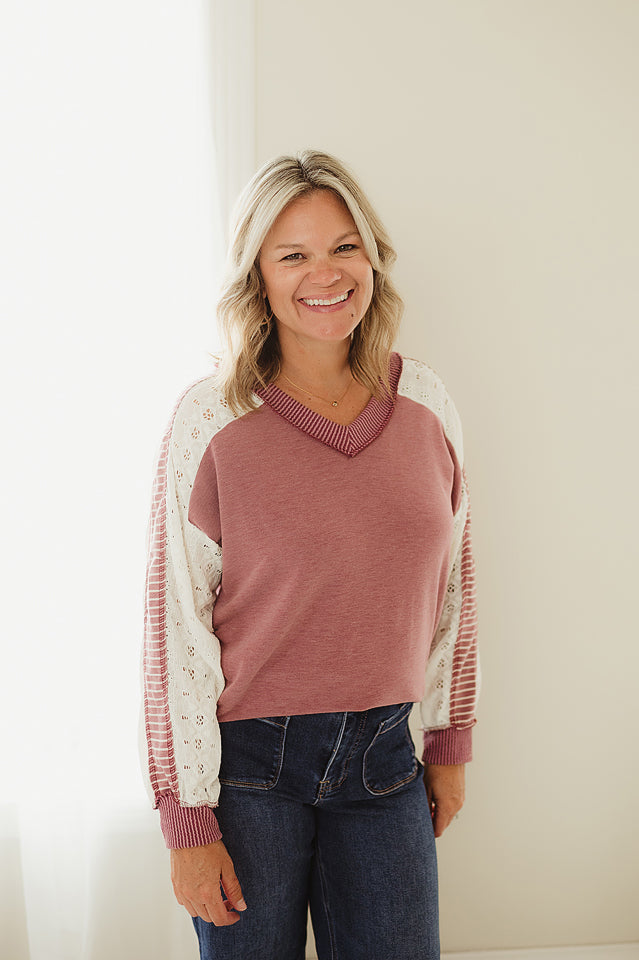The Bloom Line Lace Top is a fun mix of textures and patterns, featuring a ribbed V neckline and delicate eyelet lace. Its striped sleeves add a playful contrast, while the curved hi-low hem and relaxed fit keep things comfy and stylish. Perfect for adding a little whimsy to your everyday look!