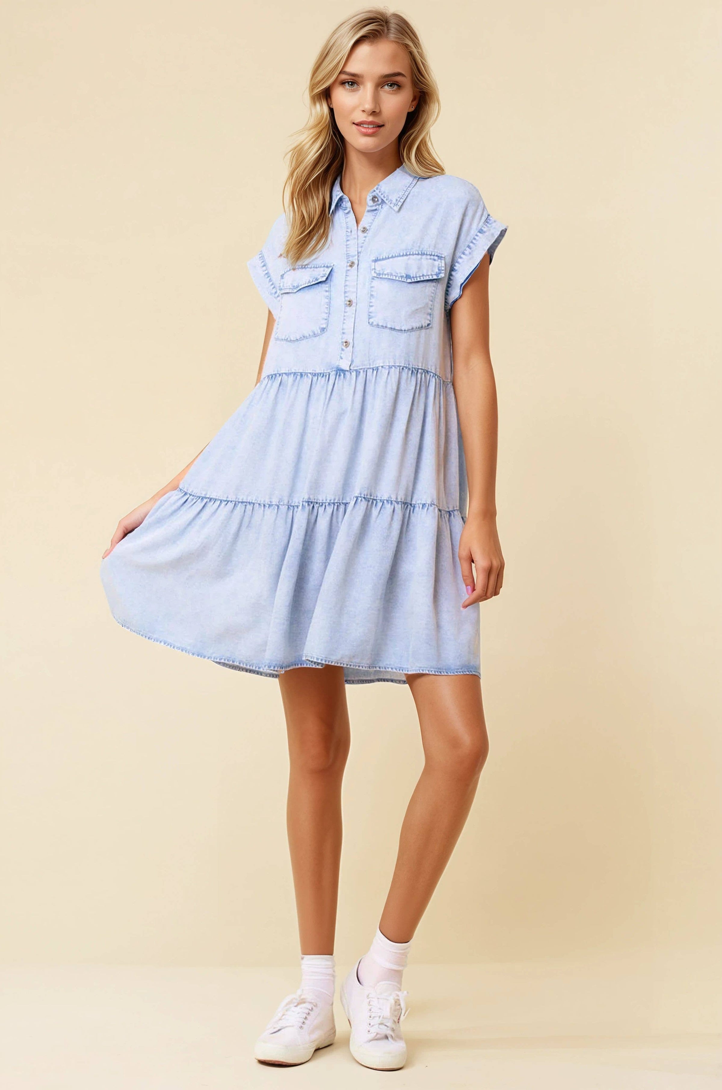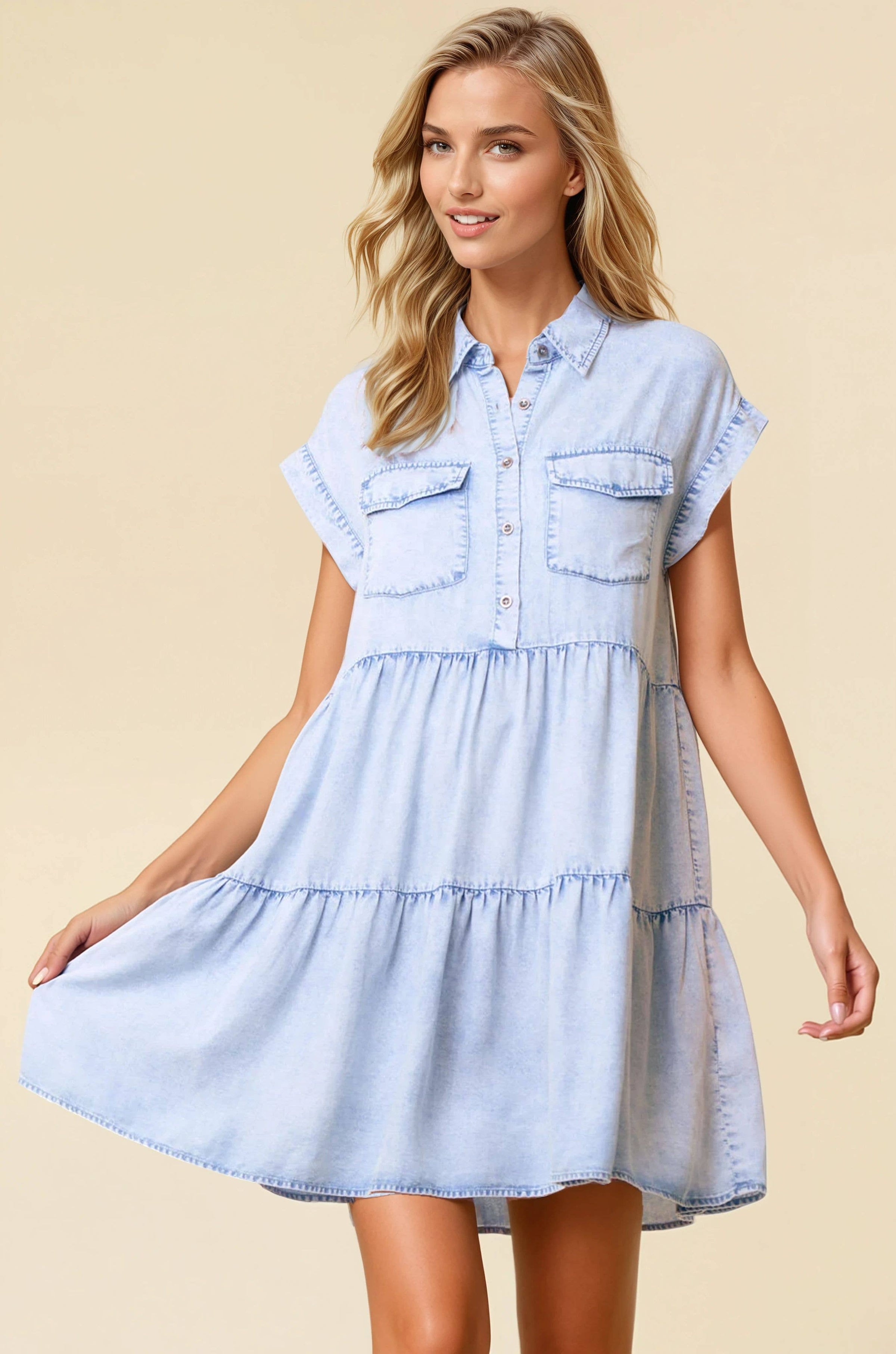 Slip into the Blue Bell Breeze, a playful tiered mini dress designed for effortless charm. Featuring a half button-down front for easy wear and an adjustable neckline, this dress offers a relaxed fit with dolman short sleeves. Made from soft, lightweight Tencel denim in a light wash, it keeps you cool and comfy all day. The front pocket adds a touch of casual fun, while the flowy silhouette flatters every move—perfect for sunny days.