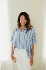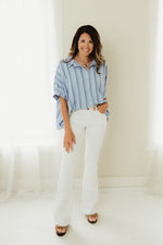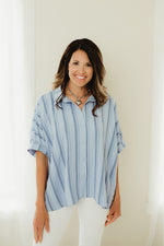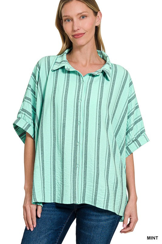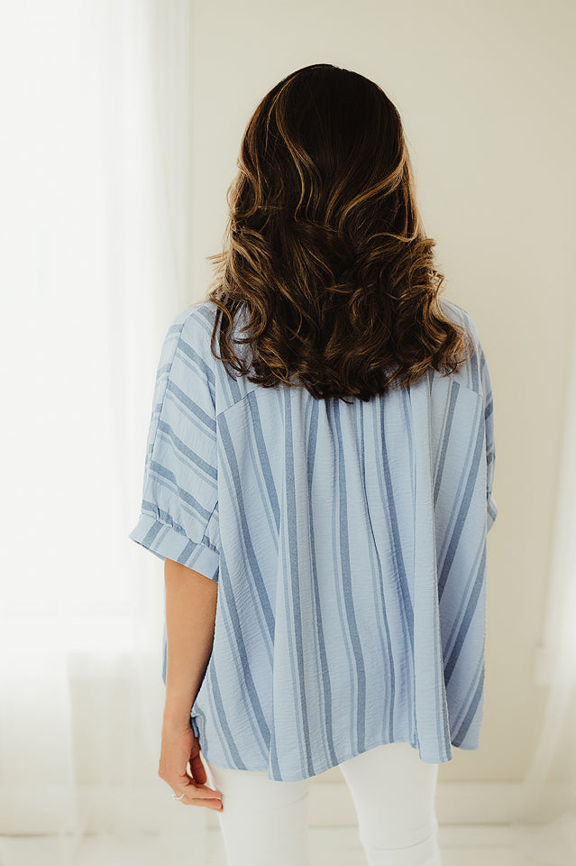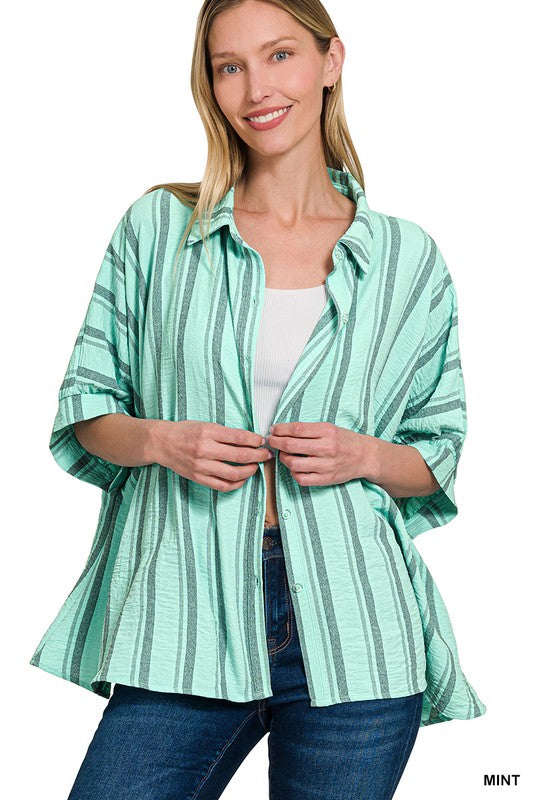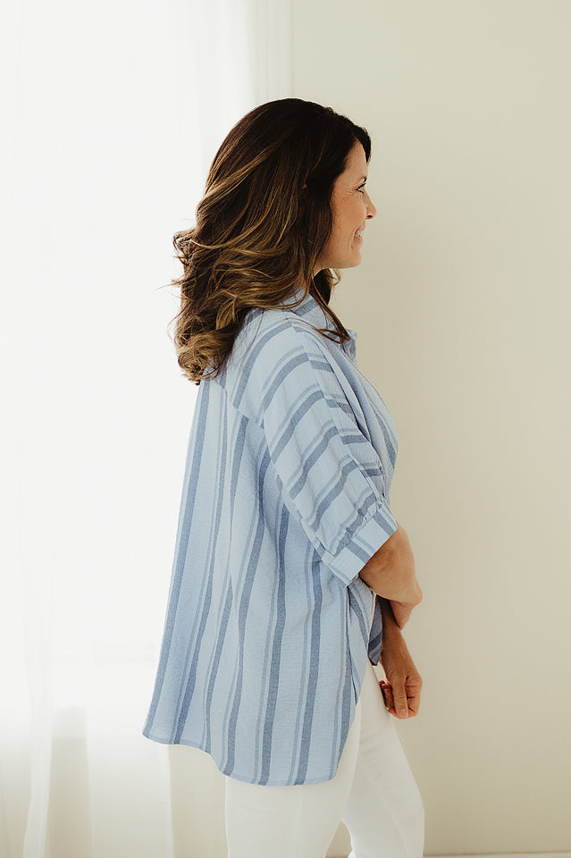 Get ready to feel the ocean breeze with our Boardwalk Breeze Top! This woven shirt features a yarn-dye stripe design that's perfect for any beach outing. Its oversized fit and button-down style provide comfort and style all in one. So go ahead, make a statement and catch some waves!