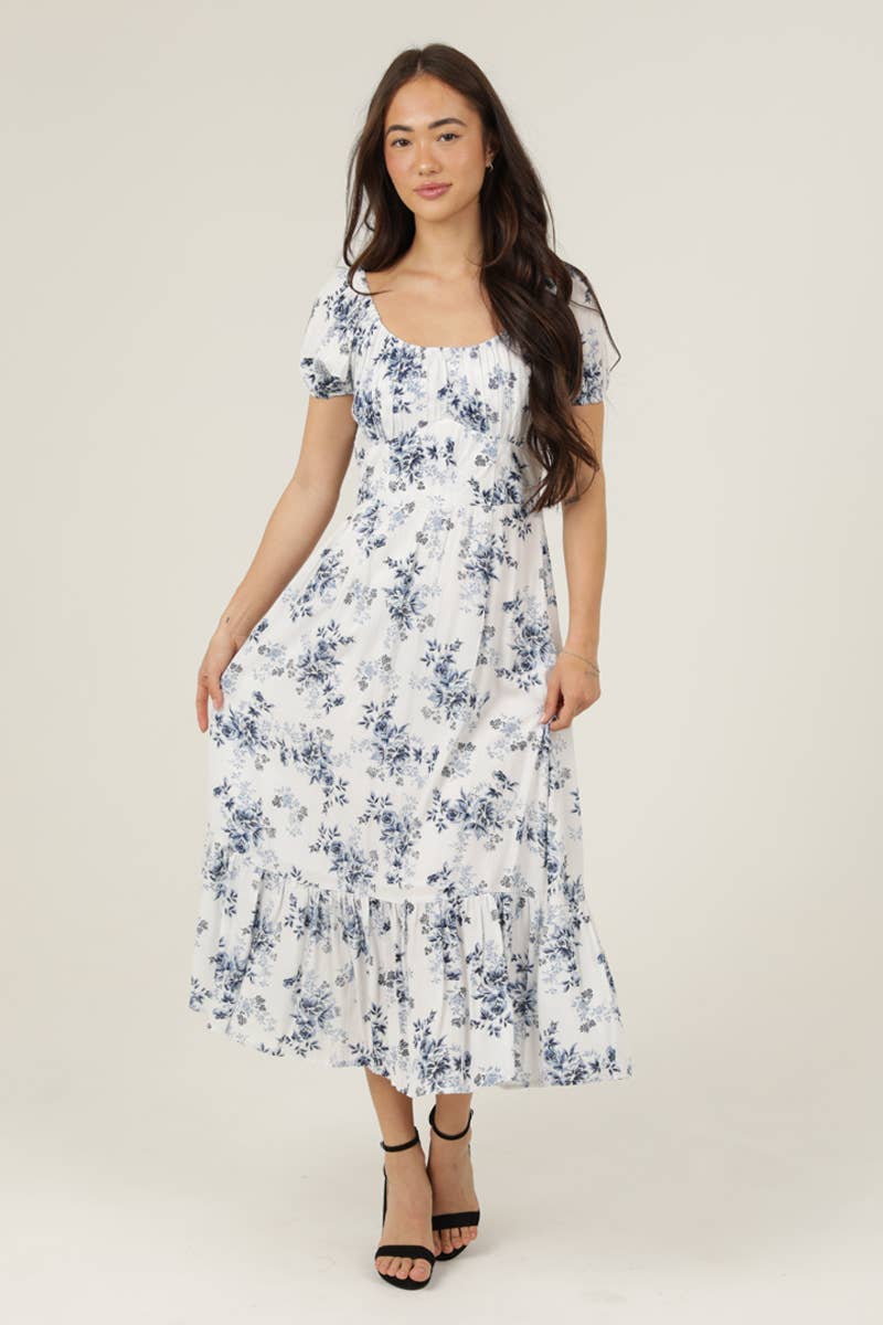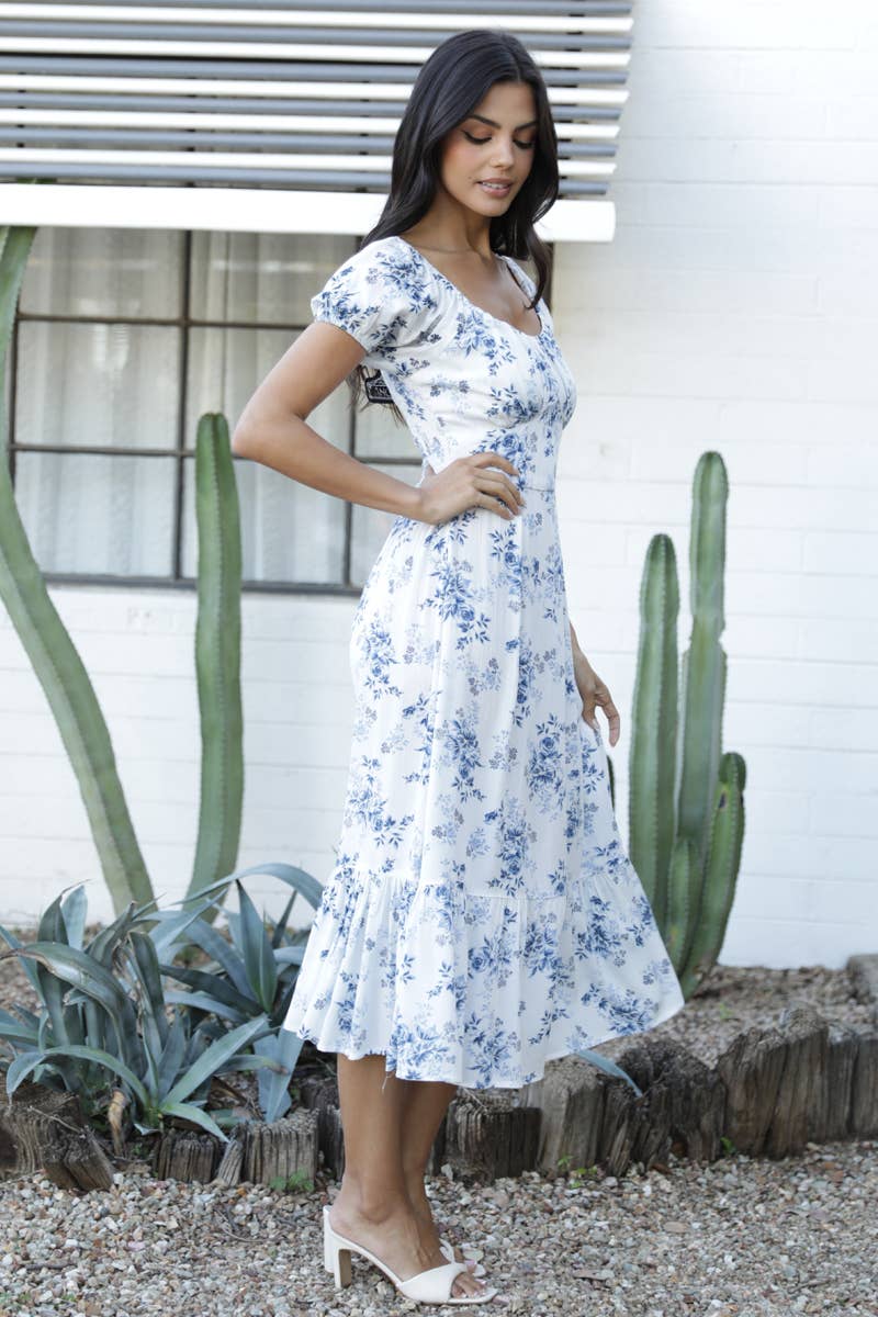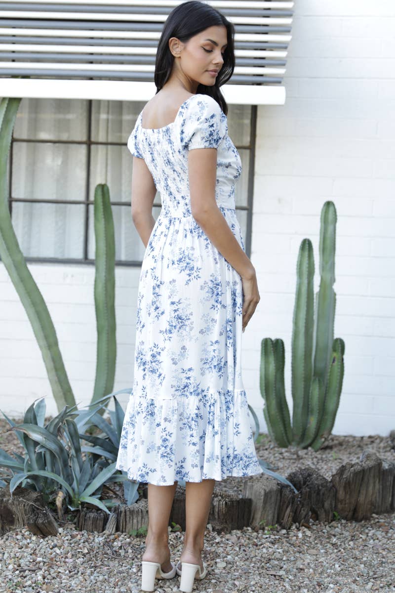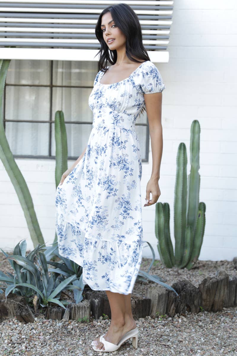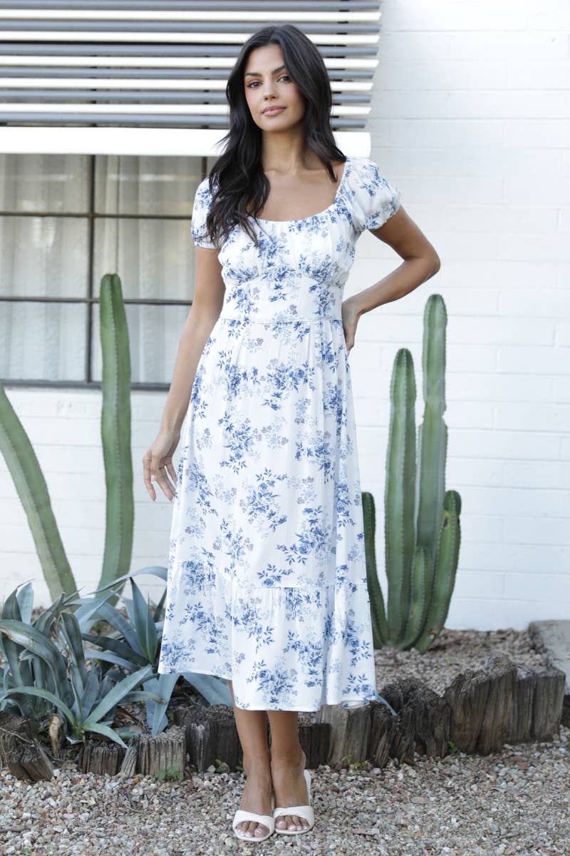 Romantic and timeless, this blue and white floral French Countryside Midi features a flattering square neckline and soft puff sleeves for a feminine touch. The fitted bodice flows into a gently gathered skirt with subtle tier detailing, creating graceful movement. Lightweight and effortlessly polished, it’s perfect for brunch, garden parties, and warm-weather occasions.