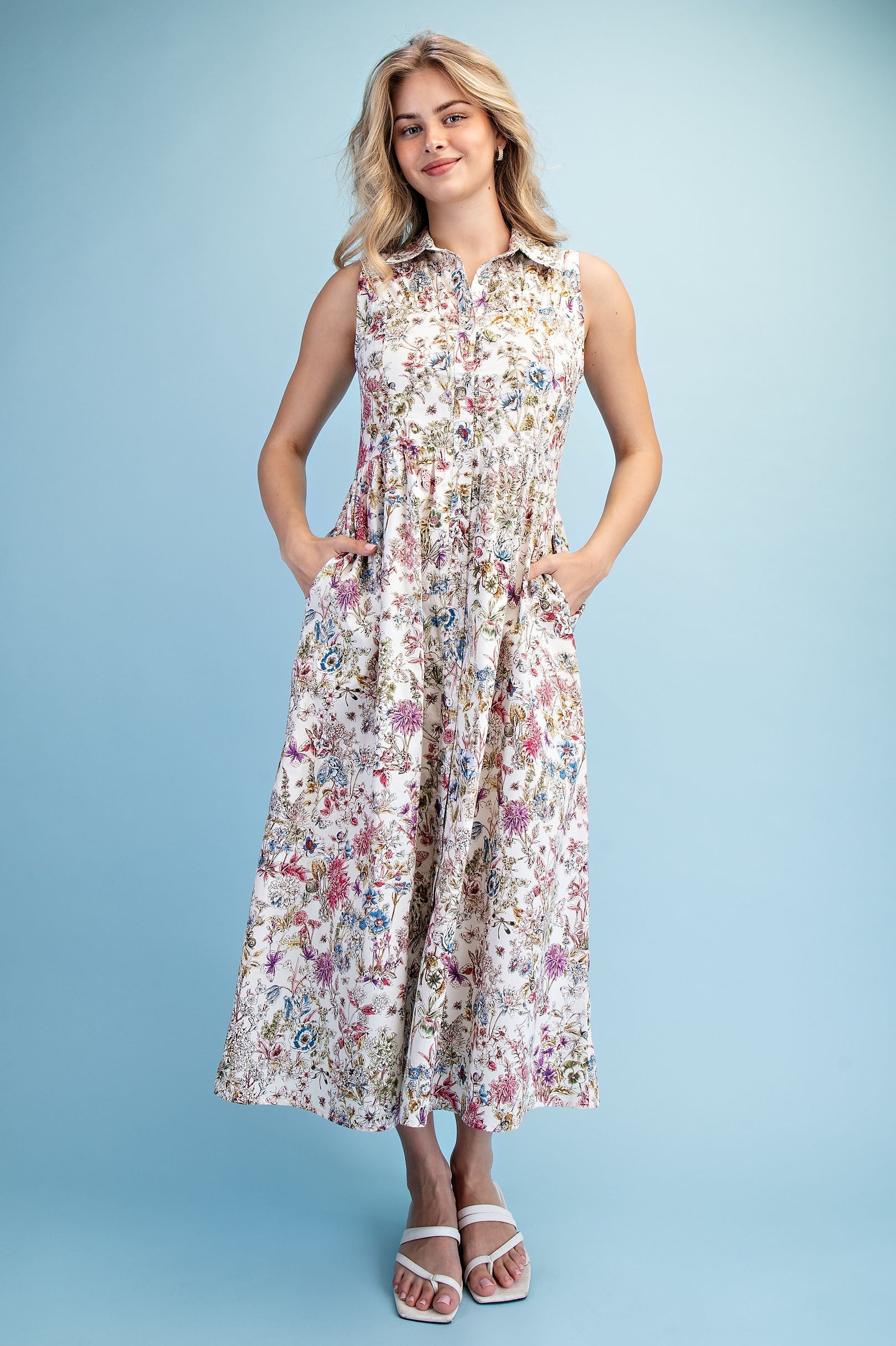 Bring effortless charm to your wardrobe with this Garden Stroll Shirt Midi. The sleeveless silhouette features a classic button-down front and crisp collar, complemented by practical side pockets for everyday ease. Sweetheart seaming at the bodice adds a flattering, feminine touch, while the smocked back ensures a comfortable, flexible fit. Fully lined for coverage, the flowing skirt showcases a vibrant garden print that captures a playful, romantic spirit. Perfect for brunches, garden parties, or weekend strolls, this dress blends timeless tailoring with relaxed, feminine elegance.
