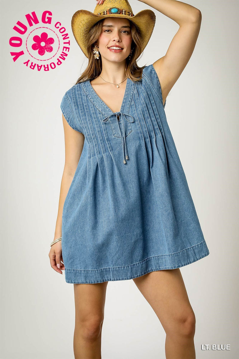 This Charm Babydoll Dress adds a stylish touch with its relaxed fit, pintuck pleat detailing, and tie-front neckline. Perfect for warm days, the sleeveless design and soft, lightweight denim make this dress a must-have for any wardrobe.