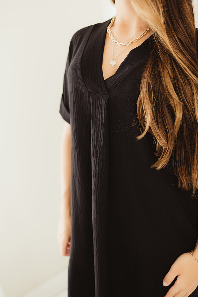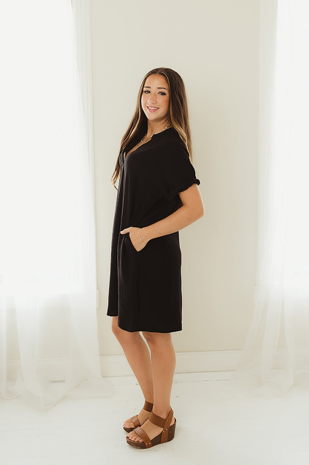 Step into easy style with this Effortless Shift Dress. Featuring a flattering v-neck placket and a charming front box pleat, it’s designed to move with you. Short sleeves with rolled cuffs add a playful touch, while side pockets keep essentials close. Made from breathable airflow woven fabric, this flowy dress keeps you cool and comfortable all day long. Perfect for sunny days or casual outings, it’s your new go-to for effortless charm.