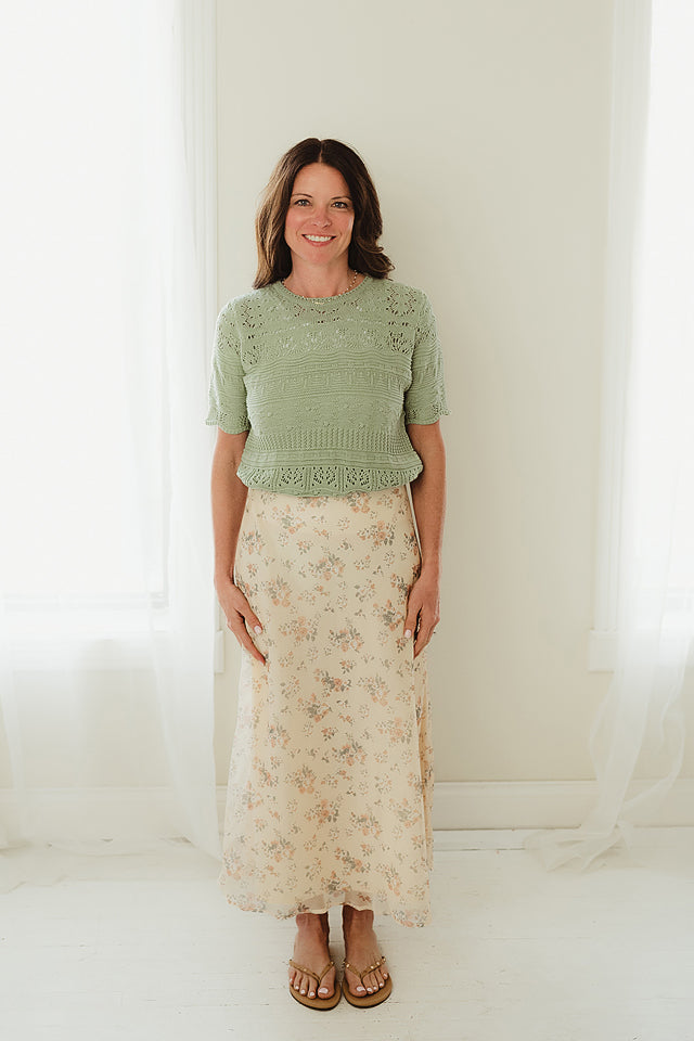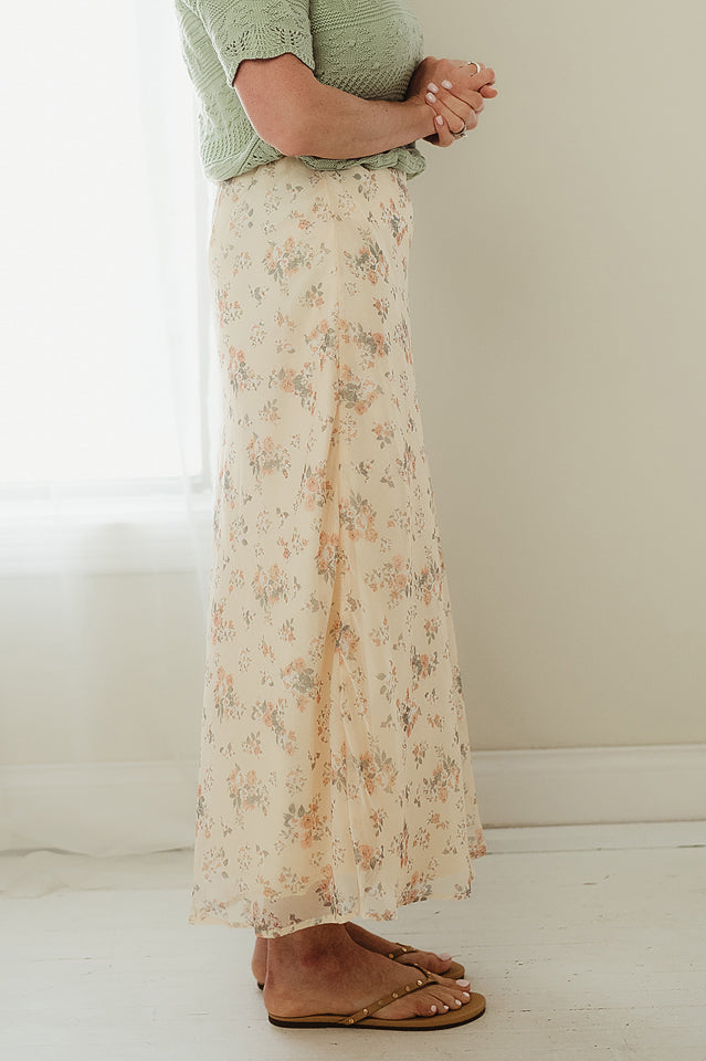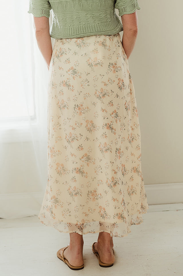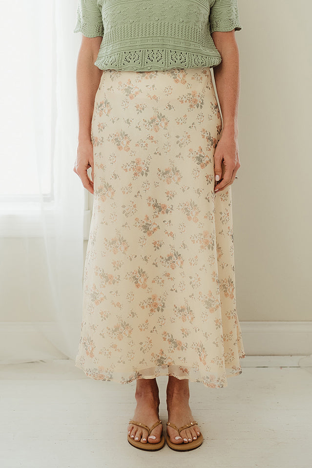 This elegant Petal Drift Skirt is cut on the bias for a naturally flattering fit, featuring a delicate floral print set against a smooth, lightweight fabric. Its fluid drape creates graceful, ethereal movement with every step, while the streamlined silhouette offers a refined, feminine shape. Effortlessly versatile, it pairs beautifully with a simple blouse or fitted top for a look that feels both polished and softly romantic.