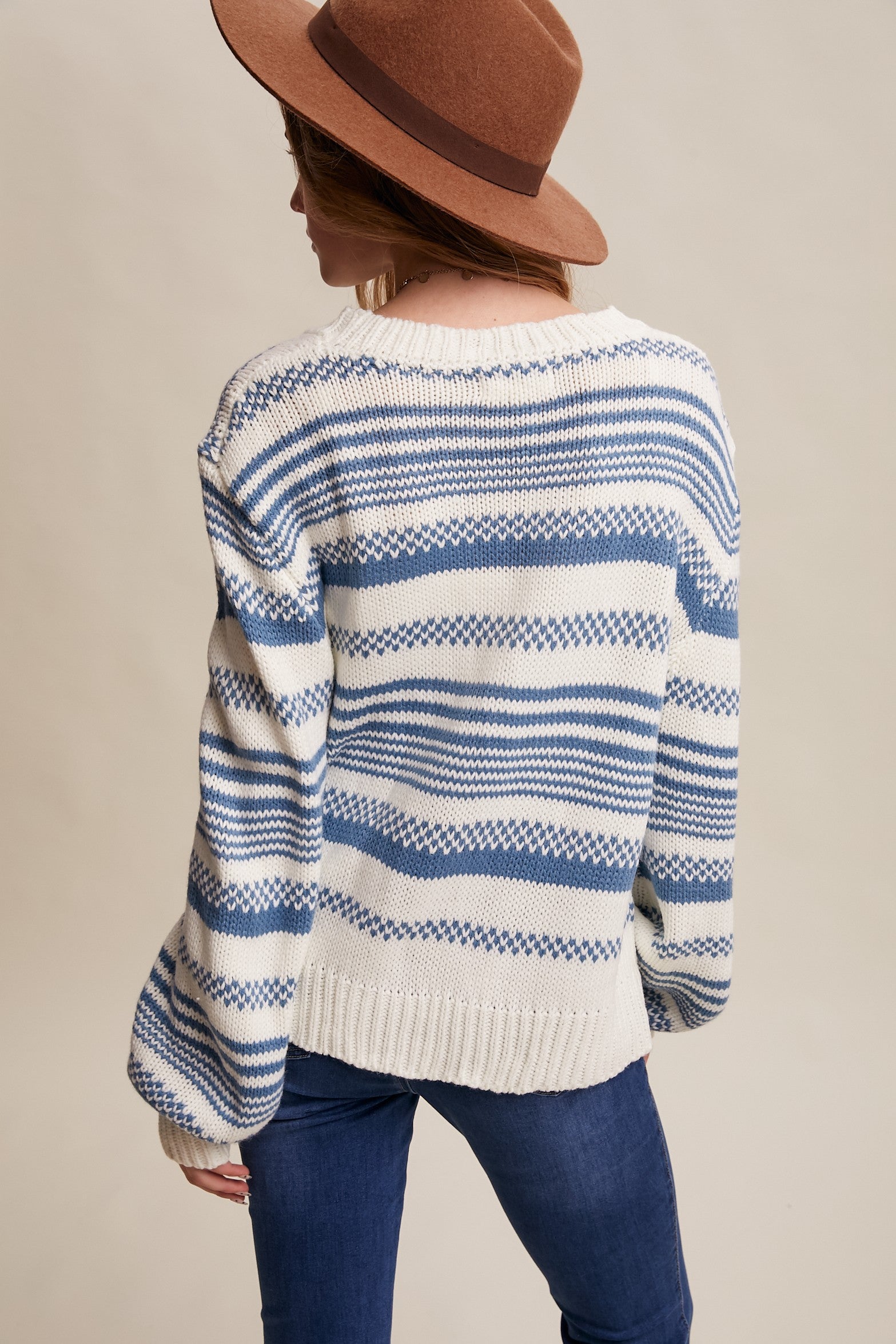 The Sierra Stripes Sweater brings cozy charm and flair to your wardrobe. Crafted from a soft, midweight blend knit, it features a striped jacquard pattern inspired by classic Fair Isle designs for a touch of rustic texture. The relaxed silhouette with drop shoulders and slightly ballooned sleeves creates an effortless, laid-back look, while chunky ribbed trim at the neckline, cuffs, and hem adds structure and warmth. Easy to style and endlessly versatile, this pullover pairs perfectly with denim shorts for a casual day out or a lace skirt for a feminine twist, offering timeless comfort with a hint of frontier spirit.
