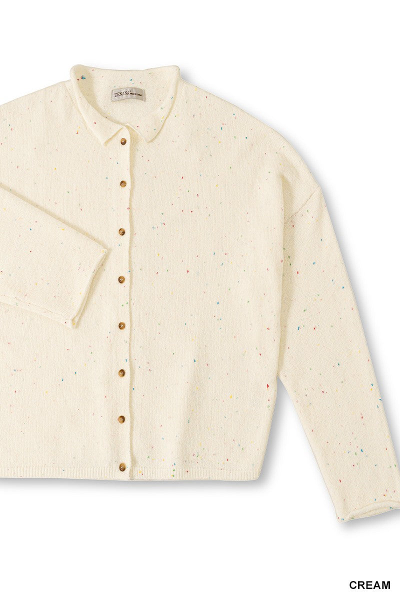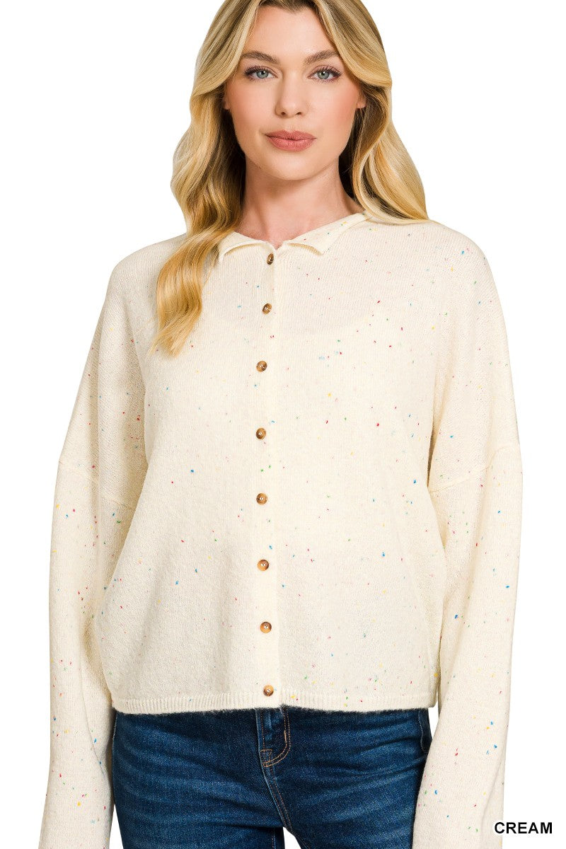The base color is a gentle, neutral cream, giving it a versatile, timeless appeal. Scattered throughout the fabric are tiny, multicolored speckles—like confetti woven subtly into the yarn.