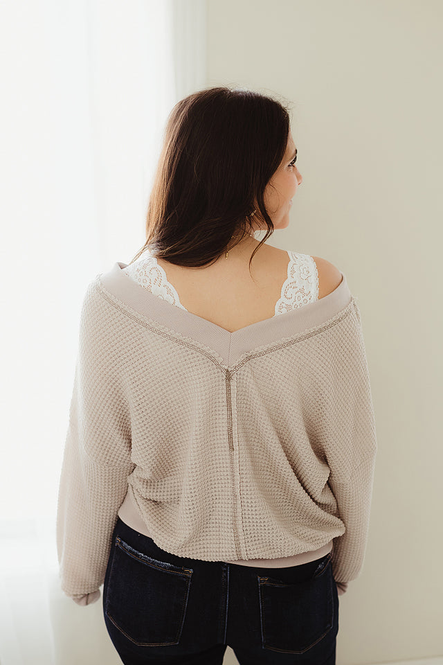 This effortlessly essential Easy Relaxed Waffle Knit features a drapey, relaxed fit with a wide V neckline and backline, dropped shoulders, and exposed seaming for added detail. Designed with long sleeves and breathable fabric, it’s the perfect layering piece for cooler days—pair it with your favorite bralette or sleeveless top for versatile styling. Cozy, oversized, and effortlessly flattering, this staple brings just the right touch of laid-back charm to any look.