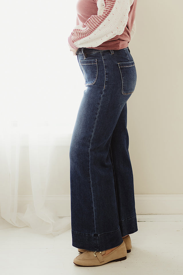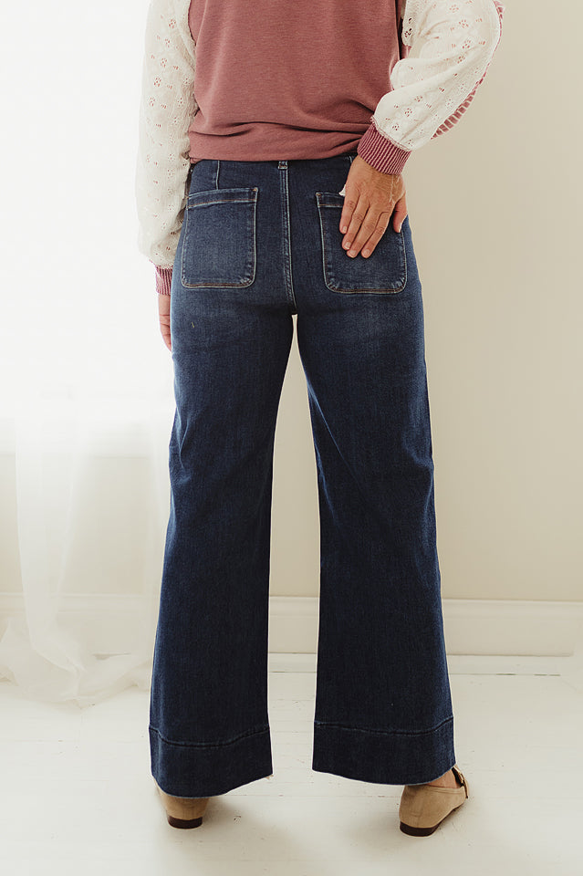 Step into fun and flair with the Kasey Pocket Jeans! These high-rise crop jeans feature wide legs and a bold front patch pocket, perfect for showing off your playful style. Comfortable and trendy, they’re your go-to for effortless cool on any casual day.