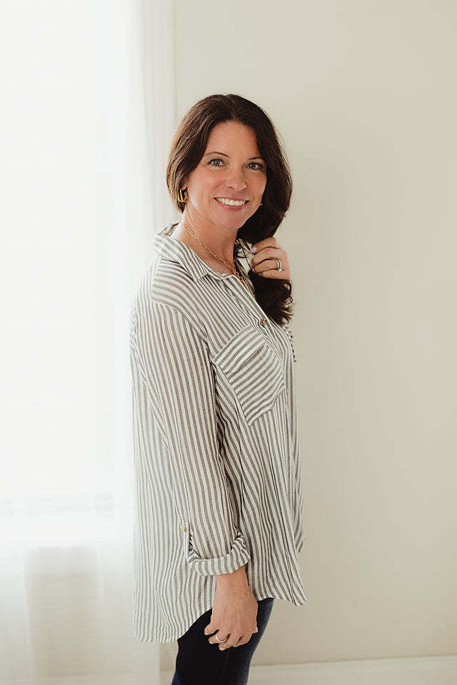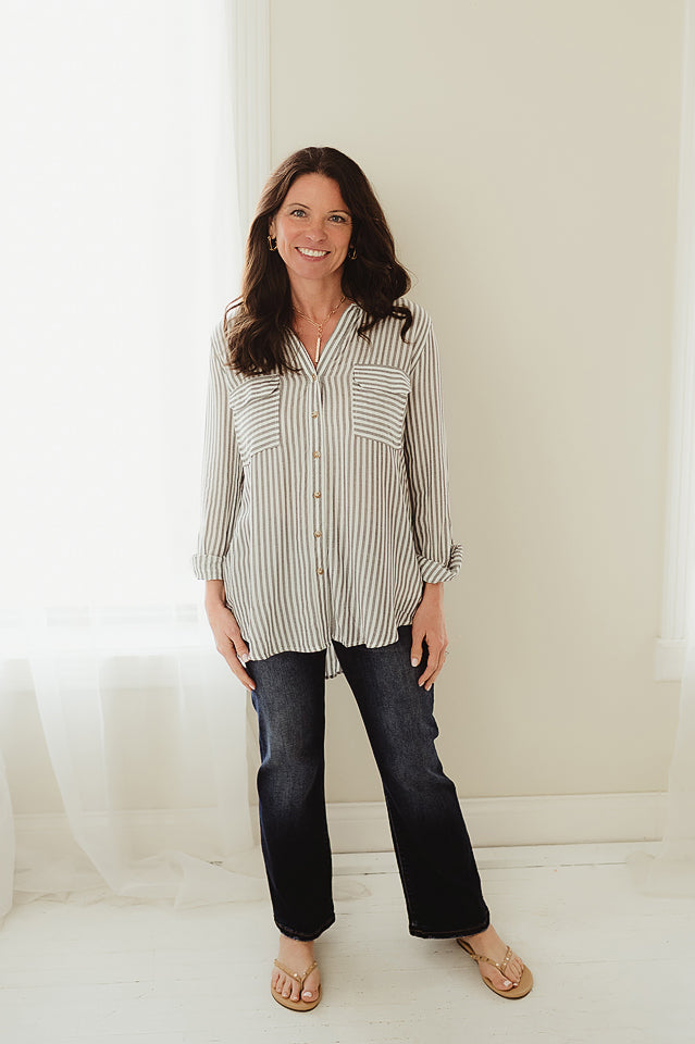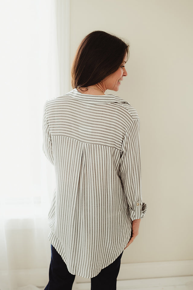 This Lightweight Striped Button Down features a classic collared neckline with a full button-down closure and long sleeves with buttoned cuffs that can be rolled up and secured with a convenient tab. Designed with a back yoke for a structured fit and left unlined for breathable comfort, it’s a versatile piece perfect for layering or wearing on its own for a polished yet relaxed look.