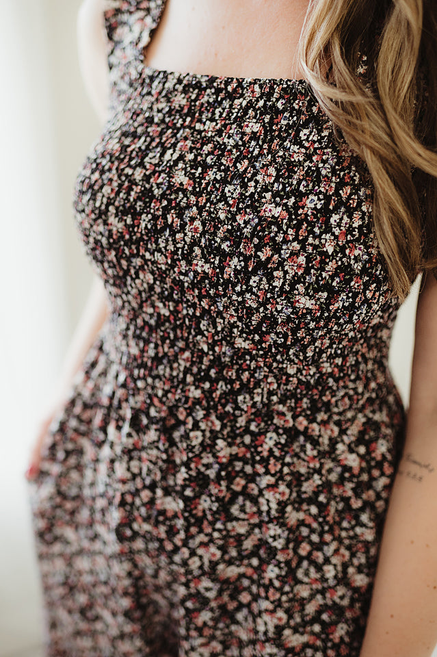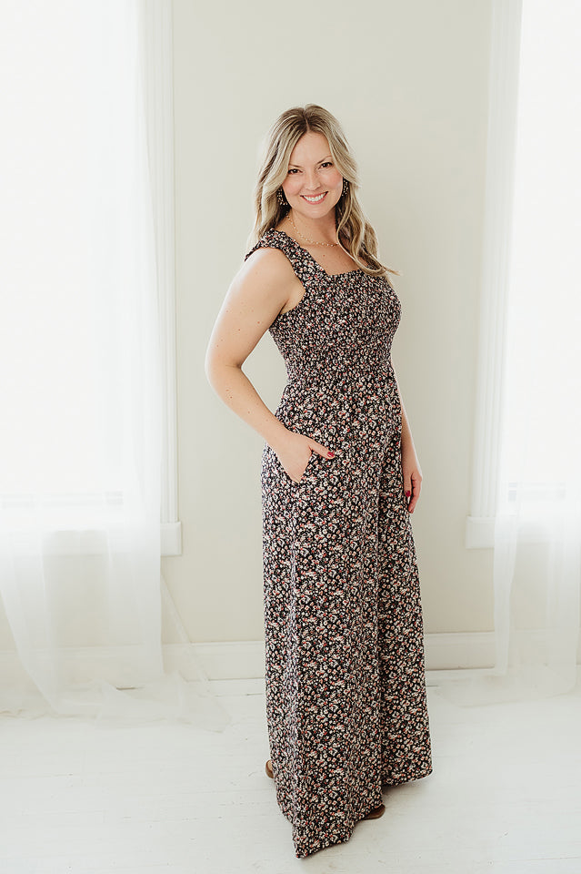 Step into effortless charm with this ditsy floral Petal Play Jumpsuit. Featuring smocked straps and a smocked chest for a comfortable, flexible fit, it flows into wide-leg pants with convenient side pockets for everyday ease. Lightweight and breezy, this playful piece is perfect for spring and summer, whether worn on its own or layered with a light jacket for a casual, free-spirited look.