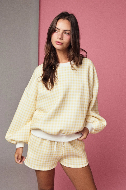 Relax in style with this effortlessly chic Gingham Lounge Set, designed to balance comfort with a playful modern edge. Crafted from lightweight, soft-hand gingham fabric, the set features an oversized drop-shoulder top with ribbed neckline and hem, paired with easy pull-on drawstring shorts for a relaxed, all-day-comfortable fit. Subtle ribbed details and a laid-back silhouette make it perfect for lounging at home, casual weekends, coffee runs, or styling with sneakers for an effortless off-duty look.
