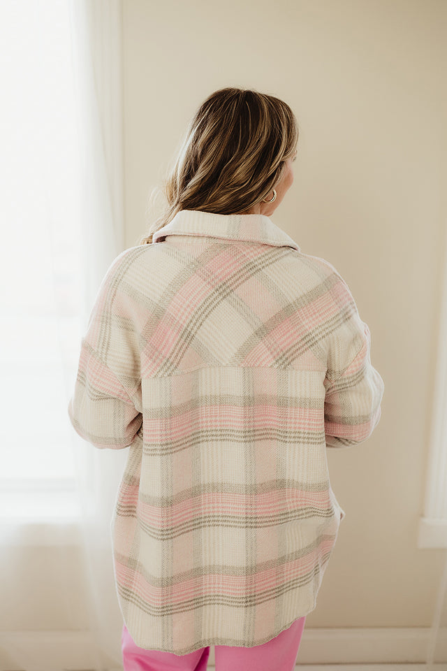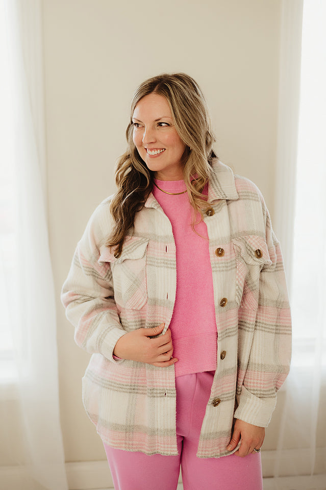 Layer up with our Pretty In Pink Plaid Shacket—the ultimate shirt-jacket hybrid that's equal parts cozy and chic. Featuring a classic plaid print in gorgeous pink tones, this oversized button-down is your new go-to for effortless style. Whether you're throwing it over a tee or wearing it solo, this versatile shacket keeps you warm while delivering that trendy, put-together vibe. Perfect for casual outings, weekend adventures, or just looking fabulous while staying comfortable. Your wardrobe's new best friend awaits!