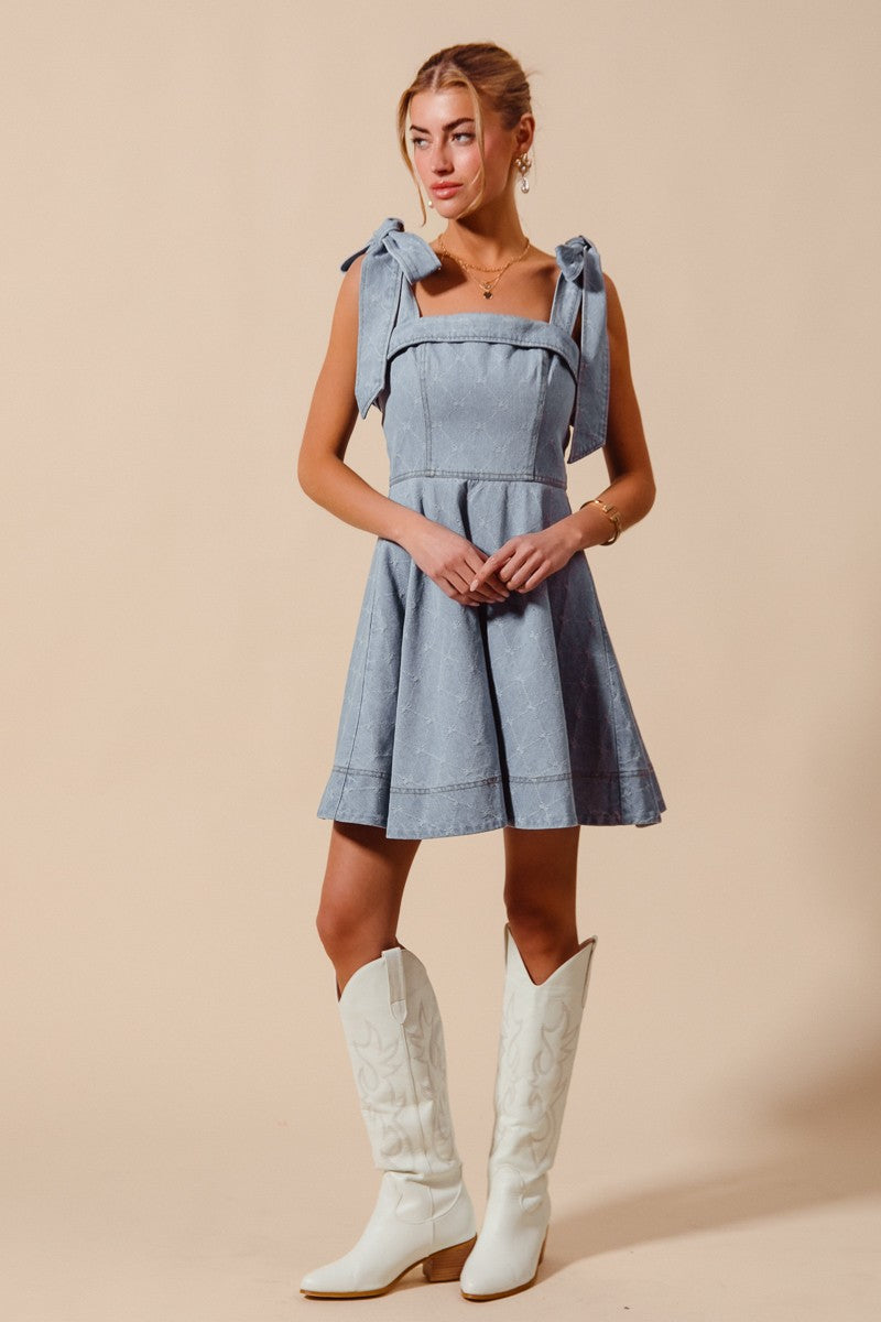 Effortlessly playful and feminine, this A-line fit-and-flare Twirl & Tie Denim Dress features a flattering silhouette that cinches at the waist and flares into a graceful skirt. The diamond bow accent and adjustable ribbon tie straps add charming, whimsical details, while the classic denim fabric keeps it versatile for day-to-night styling. Perfect with sneakers for casual outings or sandals for a polished, chic look.