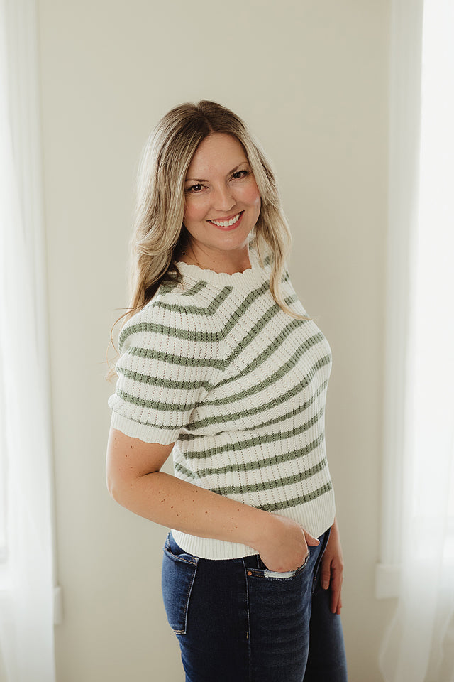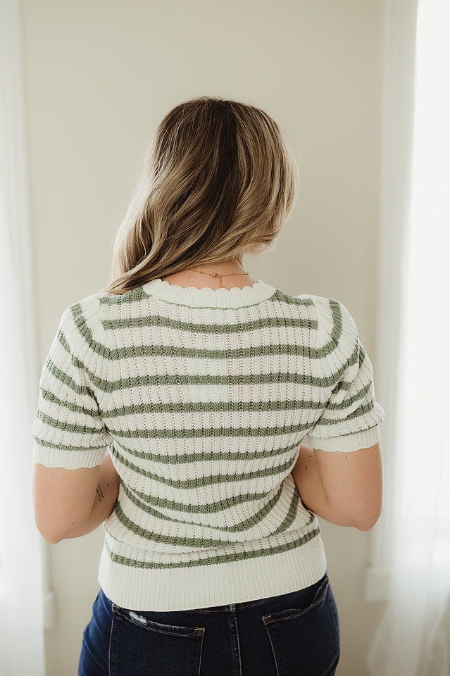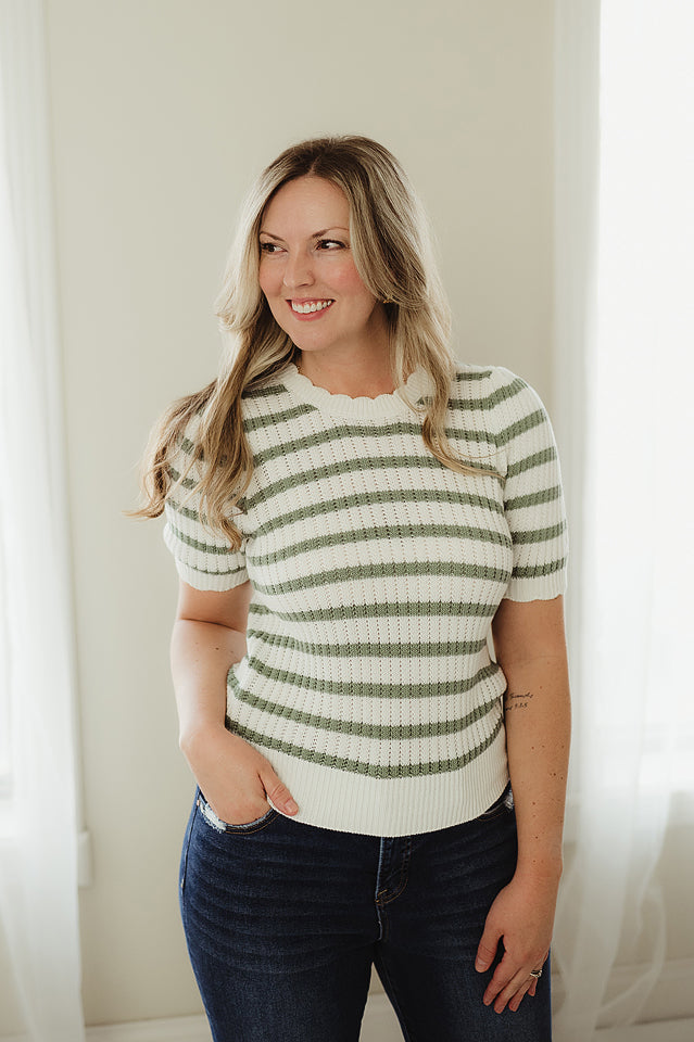 This Striped Scallop Top features a ribbed eyelet knit with playful horizontal stripes, a scalloped crew neckline, and short puff sleeves finished with a delicate scalloped edge. Cut in a fitted silhouette, it offers a polished and flattering look. Pair it with a distressed denim skirt and sandals for an effortlessly chic, everyday outfit.