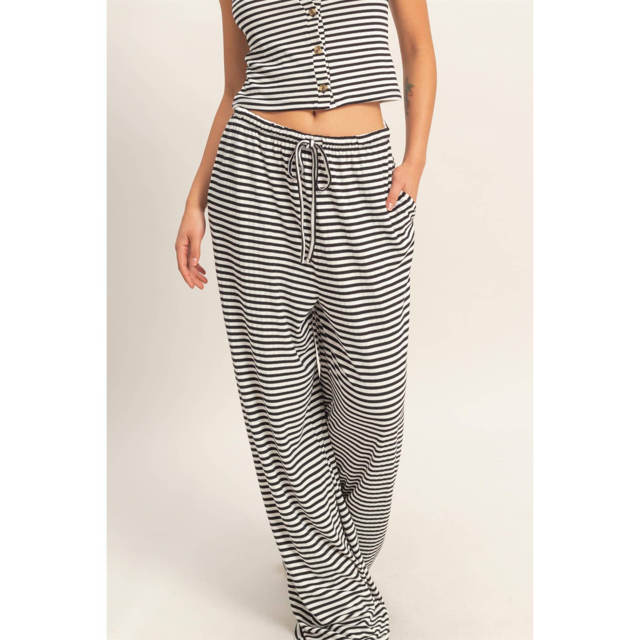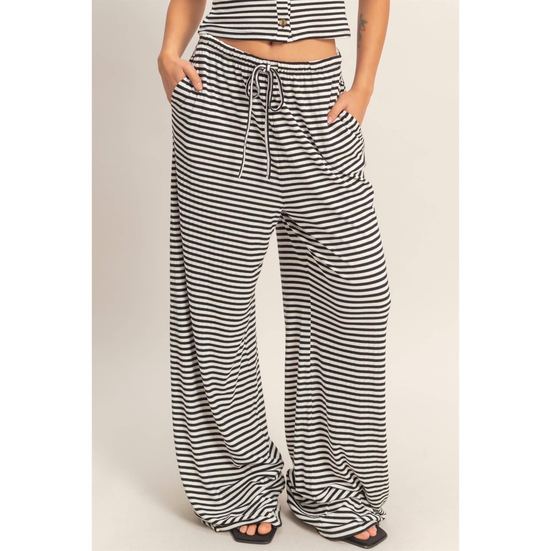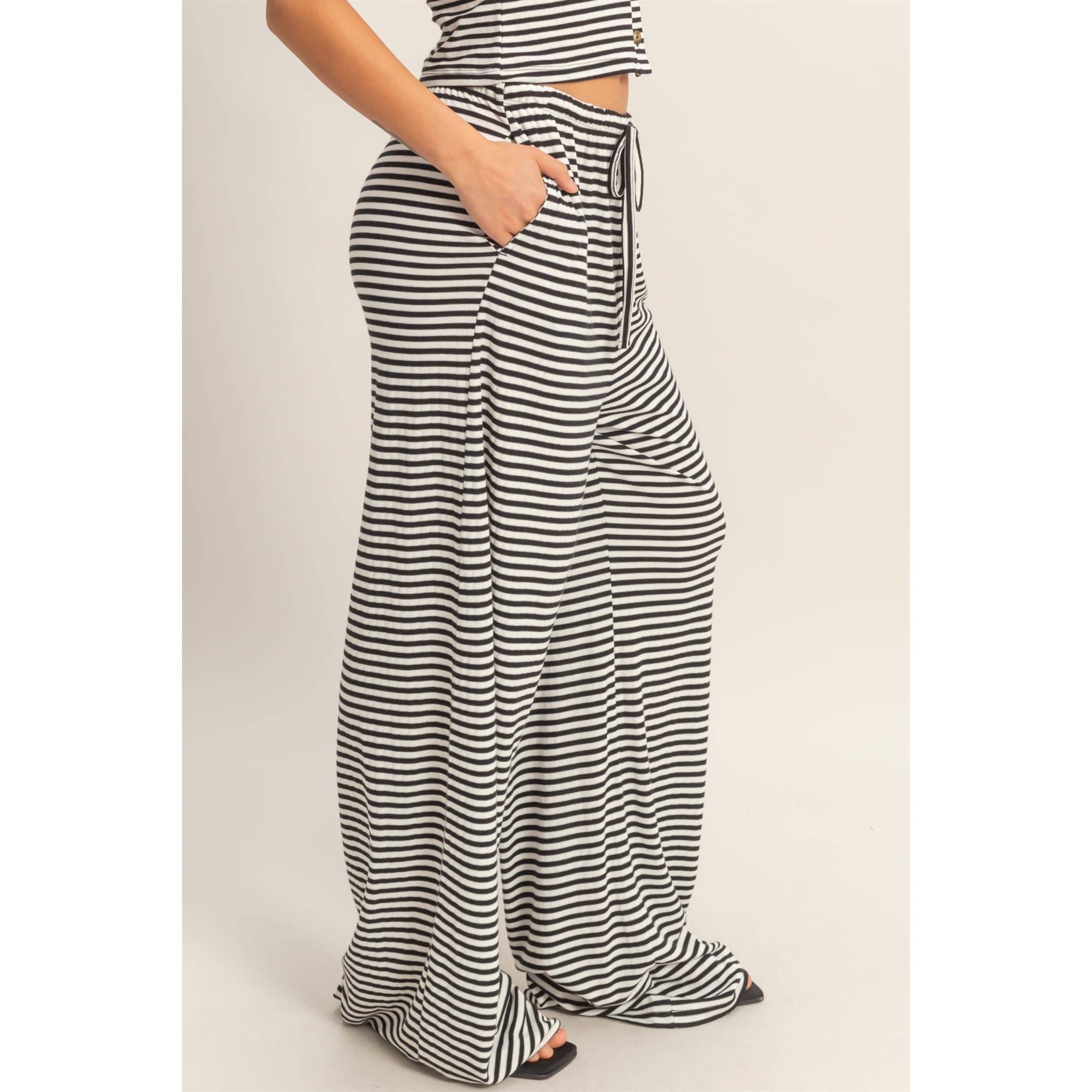 Float through your day in these effortlessly cool wide-leg Striped Crew Pants, crafted from a silky-smooth fabric that drapes like a dream. Subtle horizontal stripes add a touch of interest, while the high-rise elastic waistband with an adjustable drawstring keeps things comfy and customizable. Finished with handy side pockets and a relaxed, breezy silhouette, they’re your go-to for laid-back style. Pair with a fitted sleeveless top and simple flat sandals for an easy, chic look you’ll reach for on repeat.