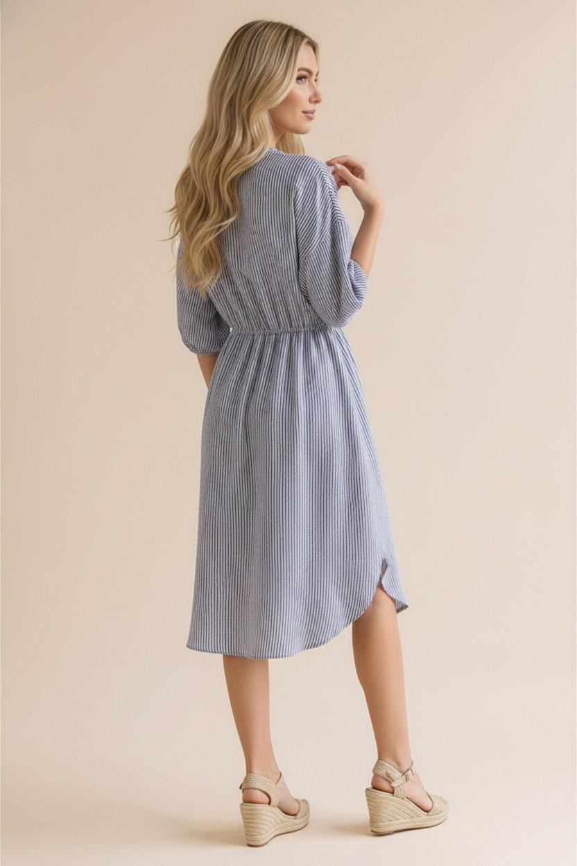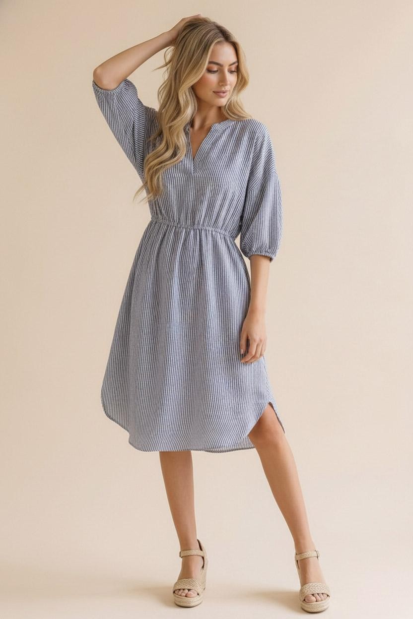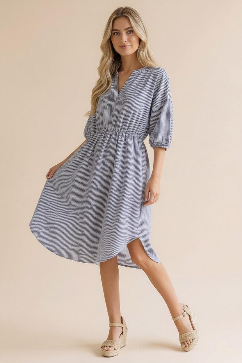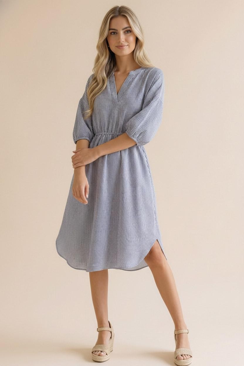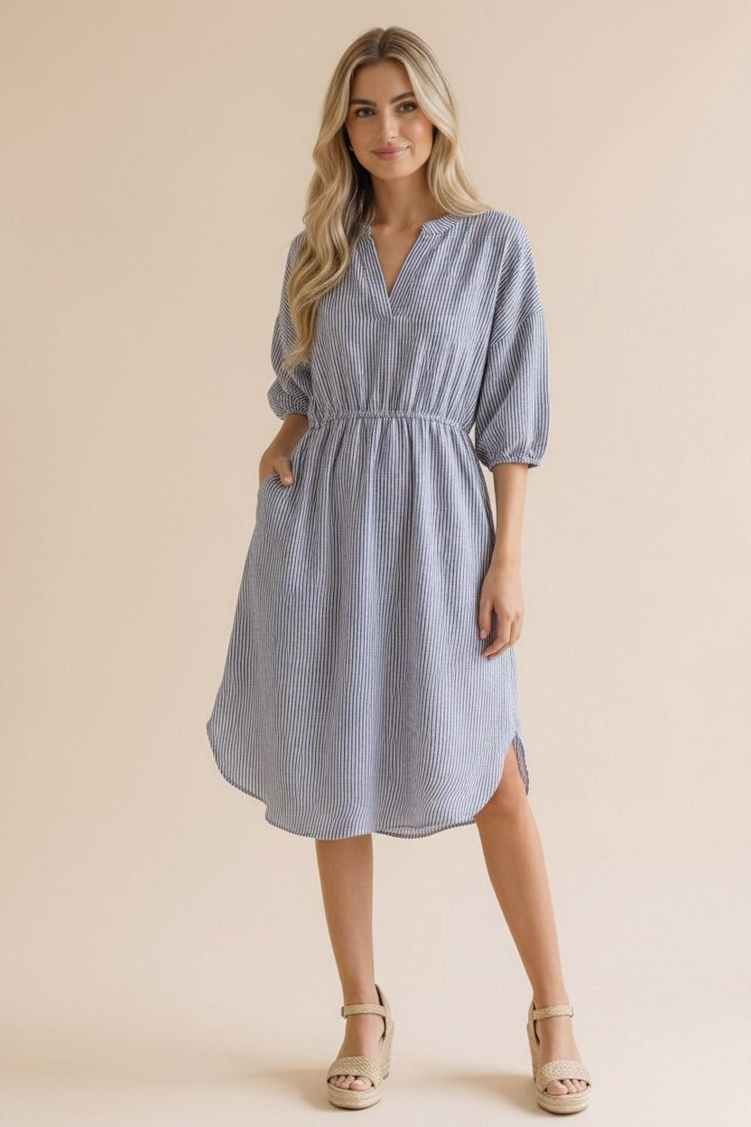 Elevate your wardrobe with this effortlessly chic midi-length Vera Stripe Midi, crafted from yarn-dyed woven fabric featuring subtle vertical stripes for a flattering, elongating effect. Designed with a modern notch neck and relaxed drop shoulders, it offers both style and comfort. The elbow-length sleeves and elasticated waist create a soft, tailored silhouette, while the shirt-tail hem adds a casual, contemporary touch. Functional side pockets provide practicality without compromising the streamlined look. Perfect for day-to-night wear, this dress combines relaxed elegance with understated sophistication.