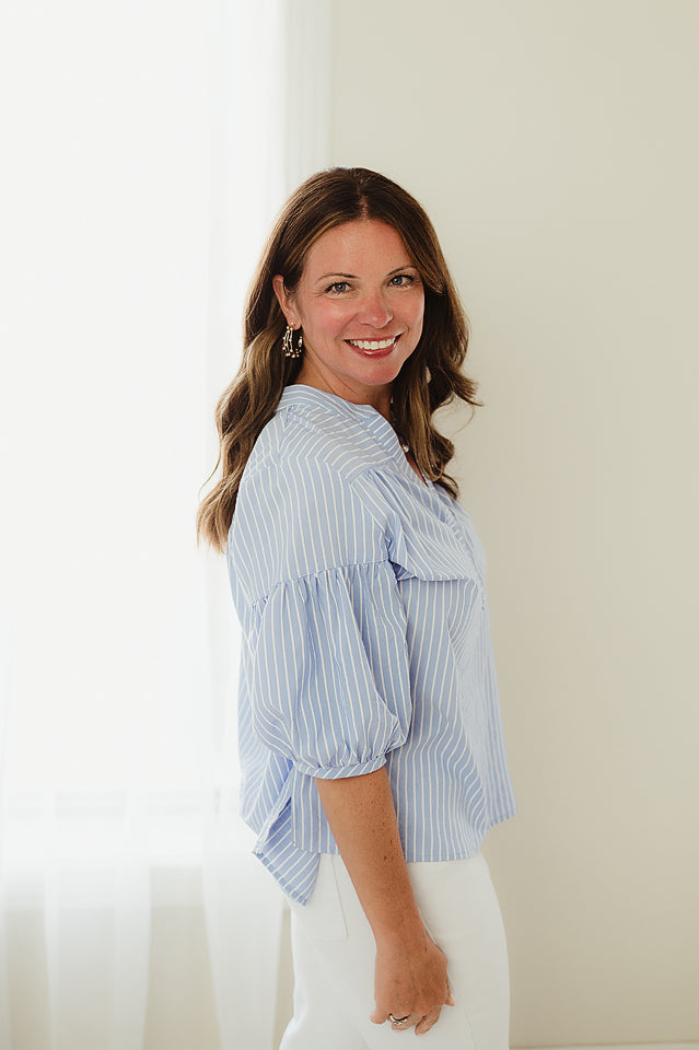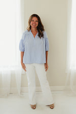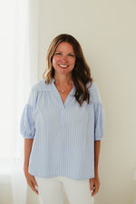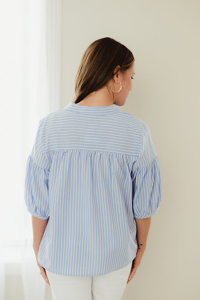 Add a playful touch to your wardrobe with our Whimsy Stripe Blouse! This unique top features a whimsical striped pattern and quarter-length bubble sleeves, making it a fun and quirky addition to any outfit. Perfect for adding a pop of color and personality to your look.